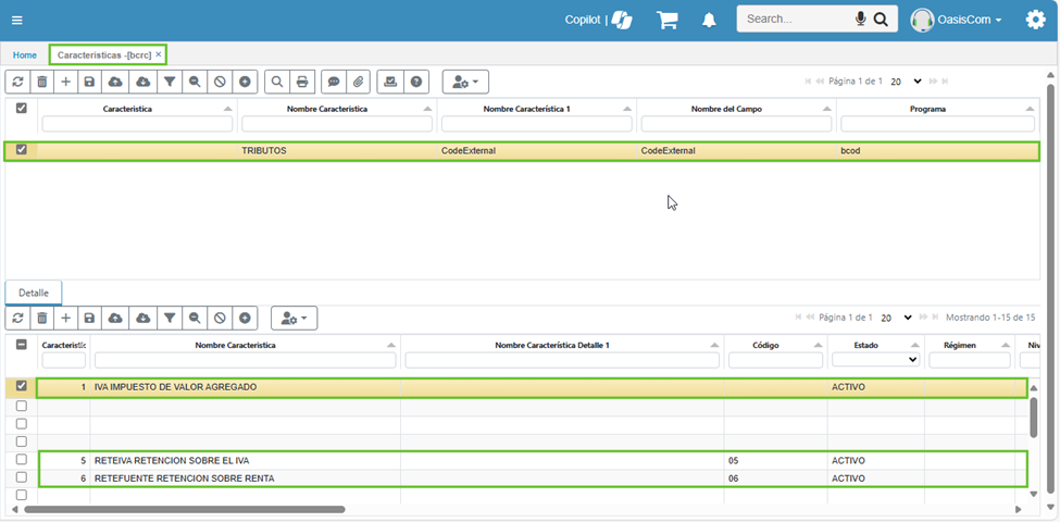 - En el detalle se visualizarán los nombres de las características, incluyendo los impuestos.
