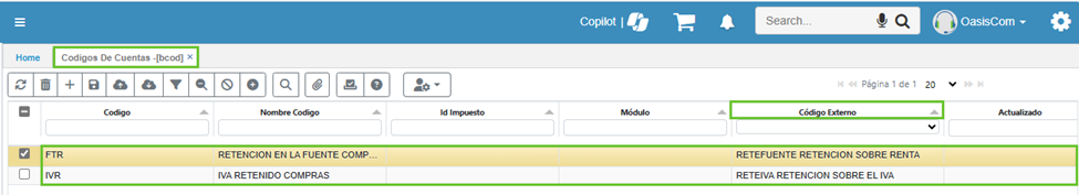 - Cada cuenta debe tener su código de homologación según la DIAN, visible en OasisCom en el campo de código external.