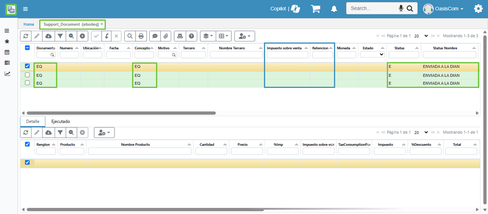 - Luego del procesamiento del documento, se puede verificar el envío correcto desde EBODEQ - Documentos Soporte.