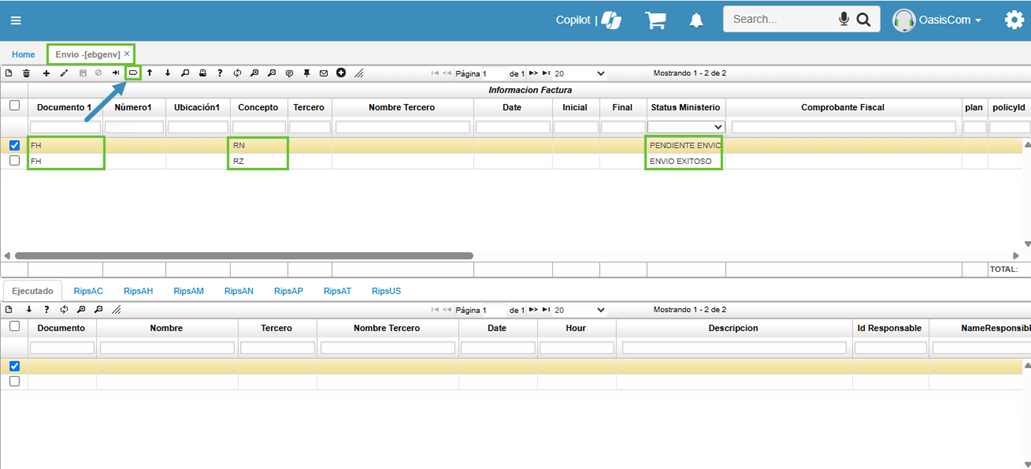 El documento FH (Factura Electrónica de Venta) por concepto RZ (Envío de RIPS) debe haber sido enviado exitosamente al Ministerio, teniendo en cuenta esto, se podrá seguir el siguiente paso.