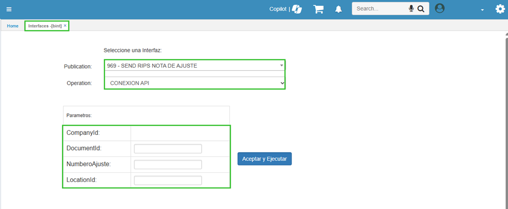 Para realizar el envío de la nota de ajuste, se debe ingresar al aplicativo BINT - Interfaces y ejecutar la opción 969 (Send RIPS NOTA DE AJUSTE). En este proceso, el sistema solicitará información como el tipo de documento, número de documento y la localización del archivo que se desea enviar.