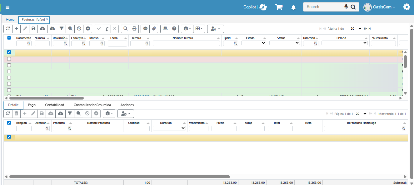 - OperationDetail: Detalle de la factura el cual incluye información del producto o servicio que adquiere el paciente, precios, total y neto entre otros; esta se ve reflejada en el detalle (desde GFAC – Facturas).