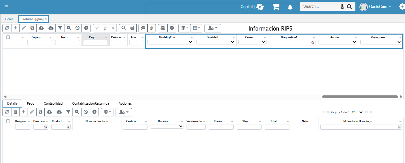 En el aplicativo GFAC – Facturas, en la parte final del maestro, se verá reflejado la información de RIPS relacionada a cada factura.