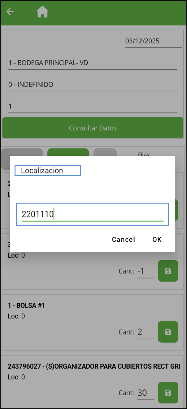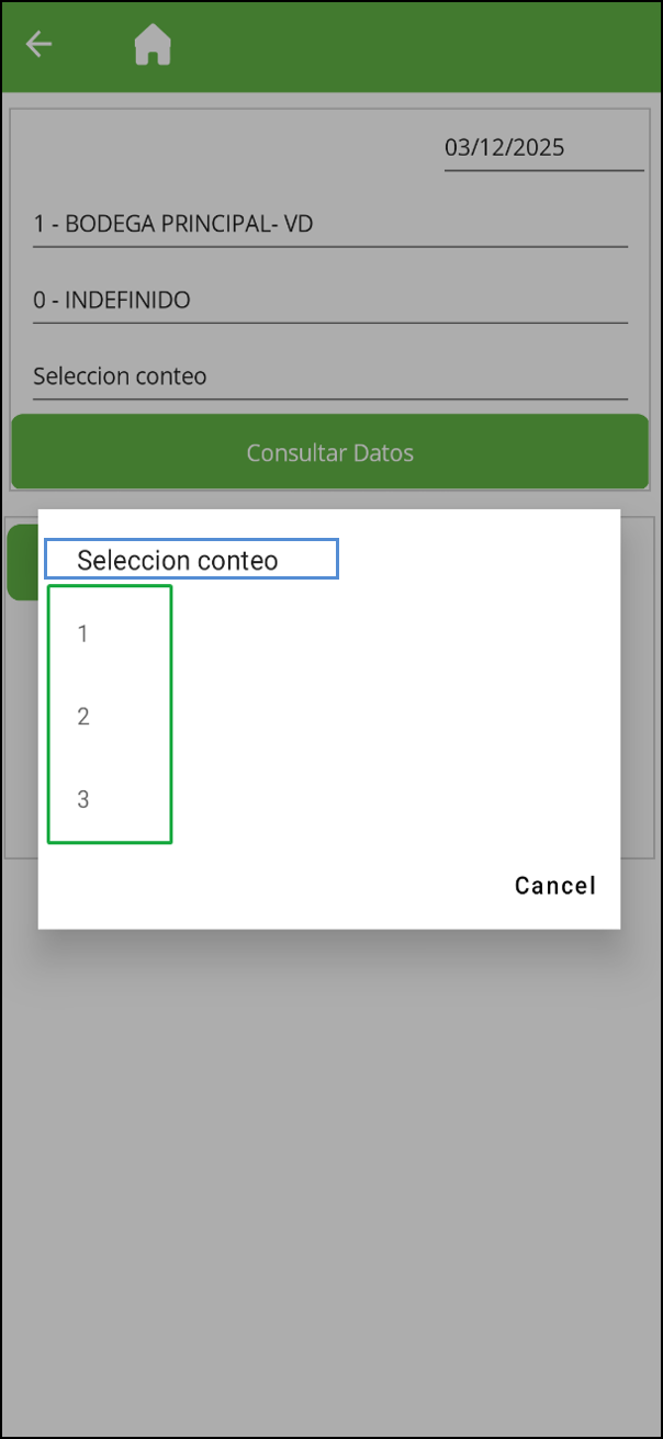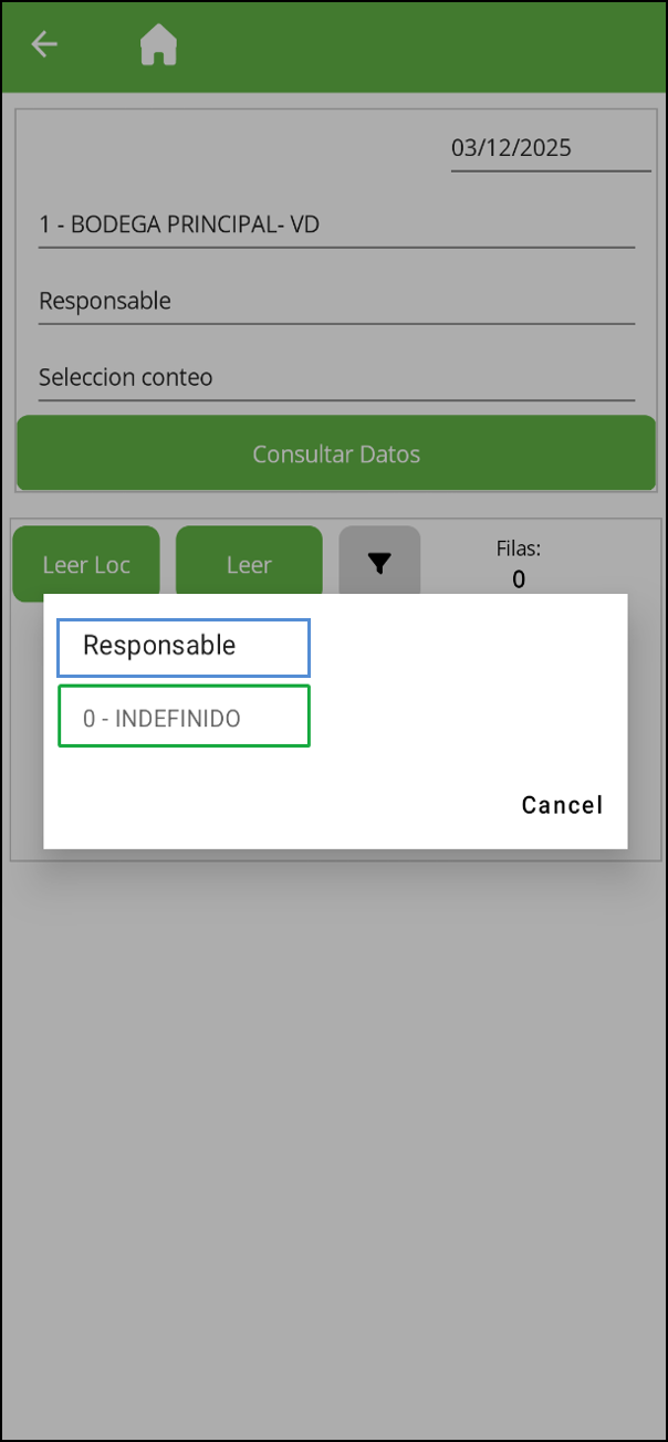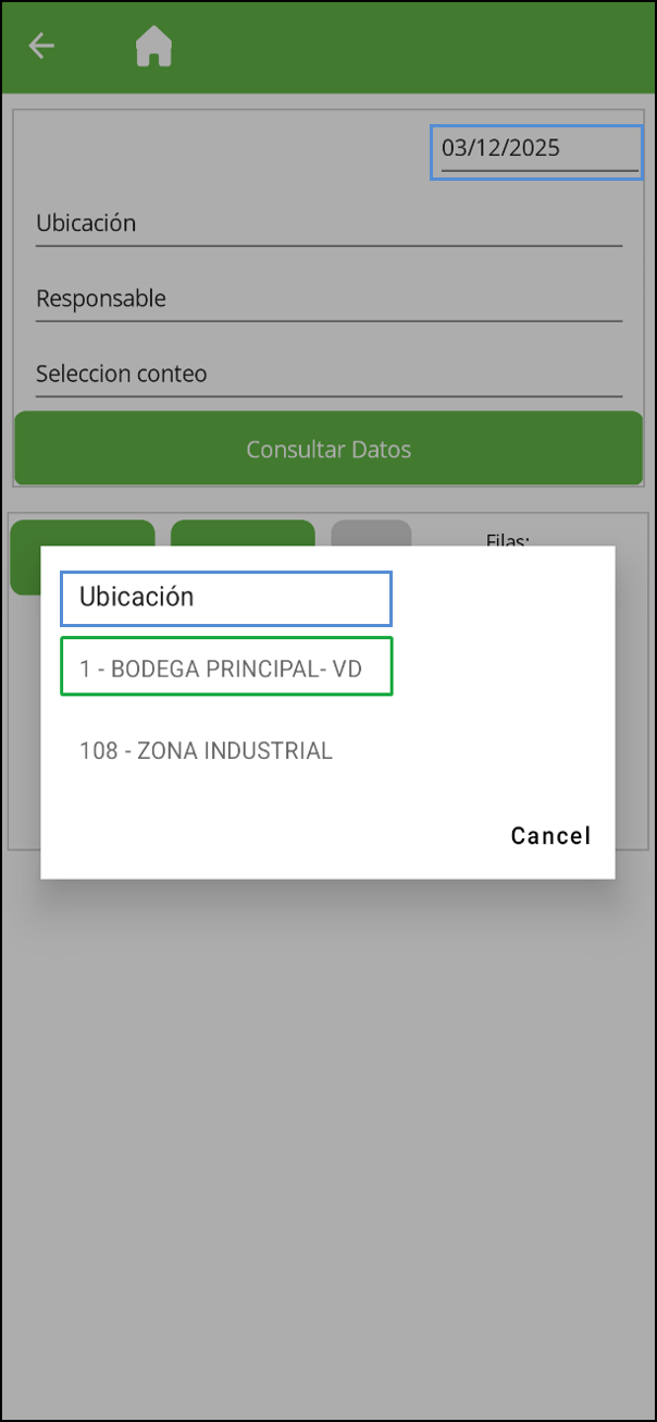 Fecha: Permite seleccionar la fecha en la que se realizó el cargue del inventario y sobre esta realizamos el proceso de conteo, ejemplo 03/12/2025.