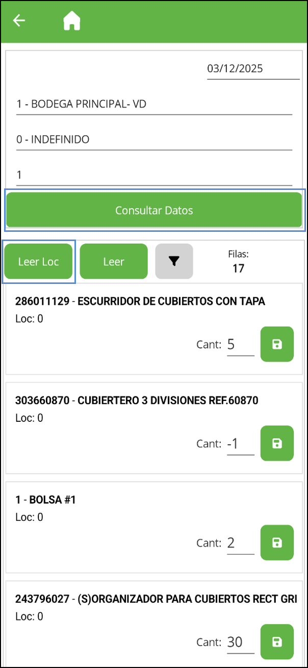 El botón de Leer Loc - Leer Localización, permite realizar un filtro más específico del inventario de los productos.