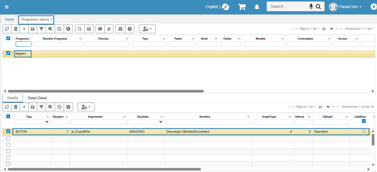 Para adicionar este botón, se incorporó desde el aplicativo SPRO – Programas donde se consulta en el maestro como programa ebgenv, en la parte del detalle, un botón denominado Descargar AttachedDocument.