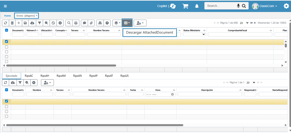 En el aplicativo EBGENV - Envio, existe un botón denominado Descargar AttachedDocument, su funcionalidad se relaciona con la descarga del XML la representación gráfica y documentos que pertenecen a RIPS, los cuales sirven para radicarlos frente a la entidad responsable del pago.