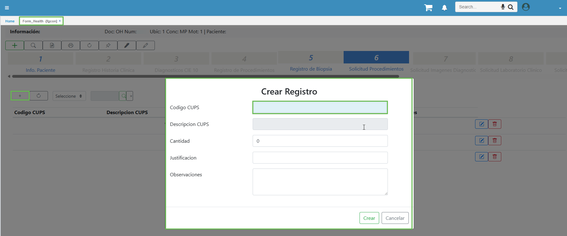 Al hacer clic en el botón +, se abrirá una ventana destinada a la creación de un nuevo registro. En dicha ventana se visualizará el campo Código CUPS, el cual debe ser diligenciado como parte del proceso de registro.