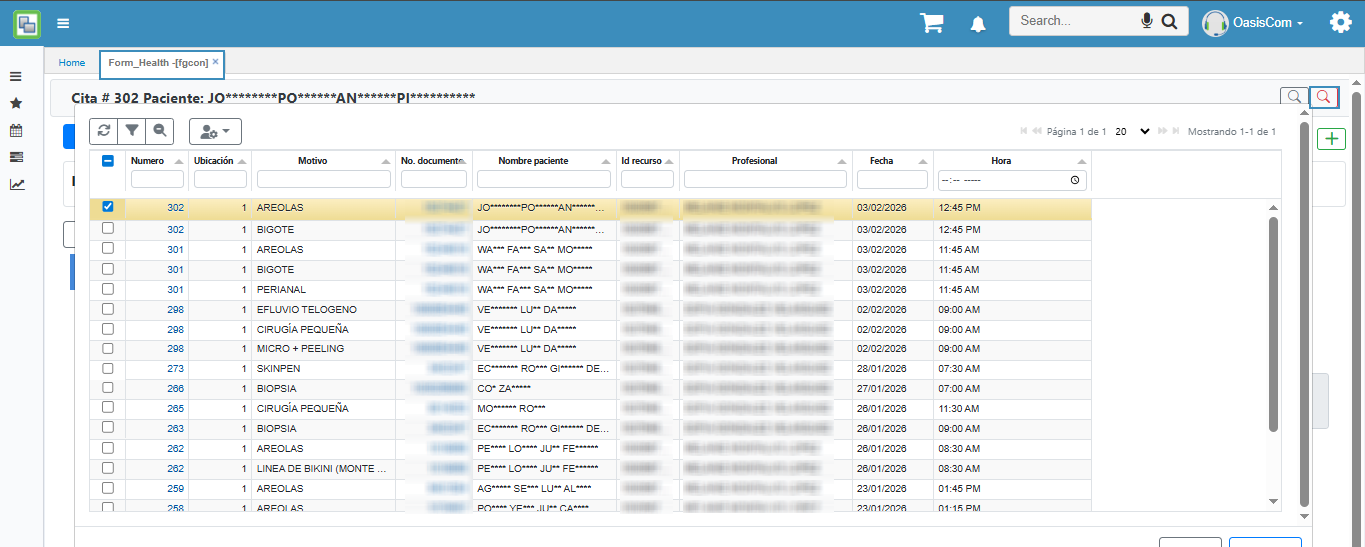 Para consultar un registro, se debe ejecutar el botón Buscar Cita, lo que mostrará los registros previamente diligenciados y activos.