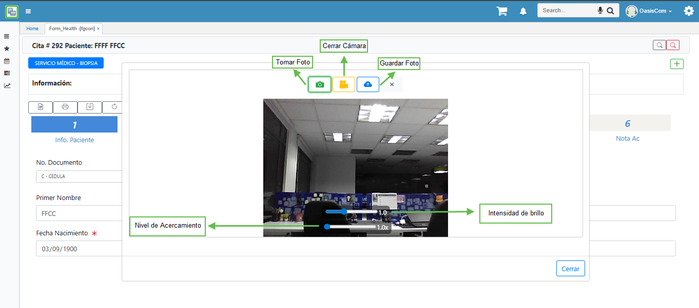 El botón Cámara permite activar la cámara del equipo para capturar imágenes del paciente directamente desde la aplicación.