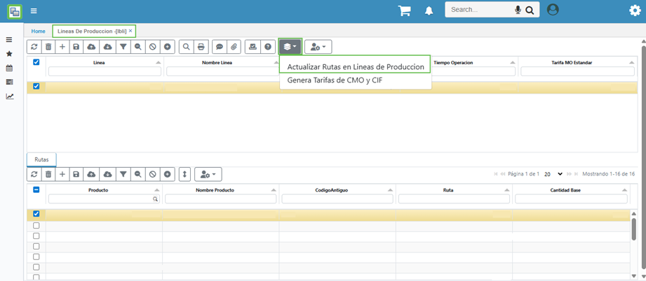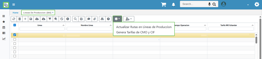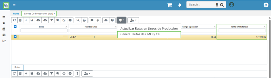 Permiten actualizar la información de rutas de producción y generar tarifas asociadas a los procesos productivos. Se debe seleccionar una línea de producción para ejecutar los botones de manera correcta.